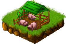 - Свинарник, доступен с 5 уровня, стоимость 30 Монет. Сажаете свиней, стоимость свиньи 10 Монет., корм получается из кукурузы, получаете продукт мясо, продать можно в лавку. Доход с полного свинарника 18 Монет. за 60 сборов продукции.