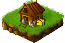 - Курятник, доступен с 1 уровня, стоимость 15 Монет. Сажаете кур, стоимость курицы 5 Монет., корм получается из пшеницы, получаете продукт яйцо, продать можно в лавку. Доход с полного курятника 9 Монет. за 60 сборов продукции.